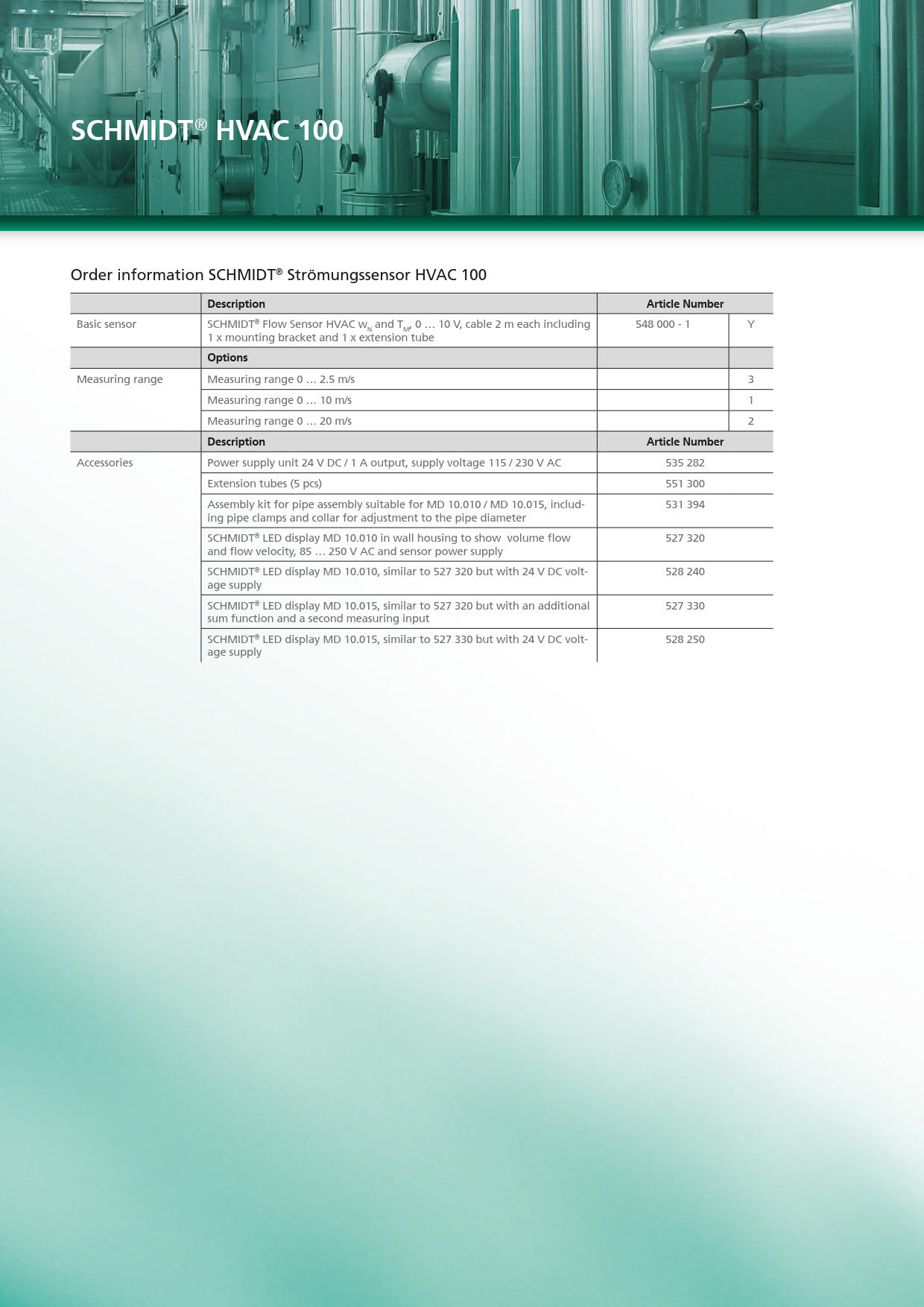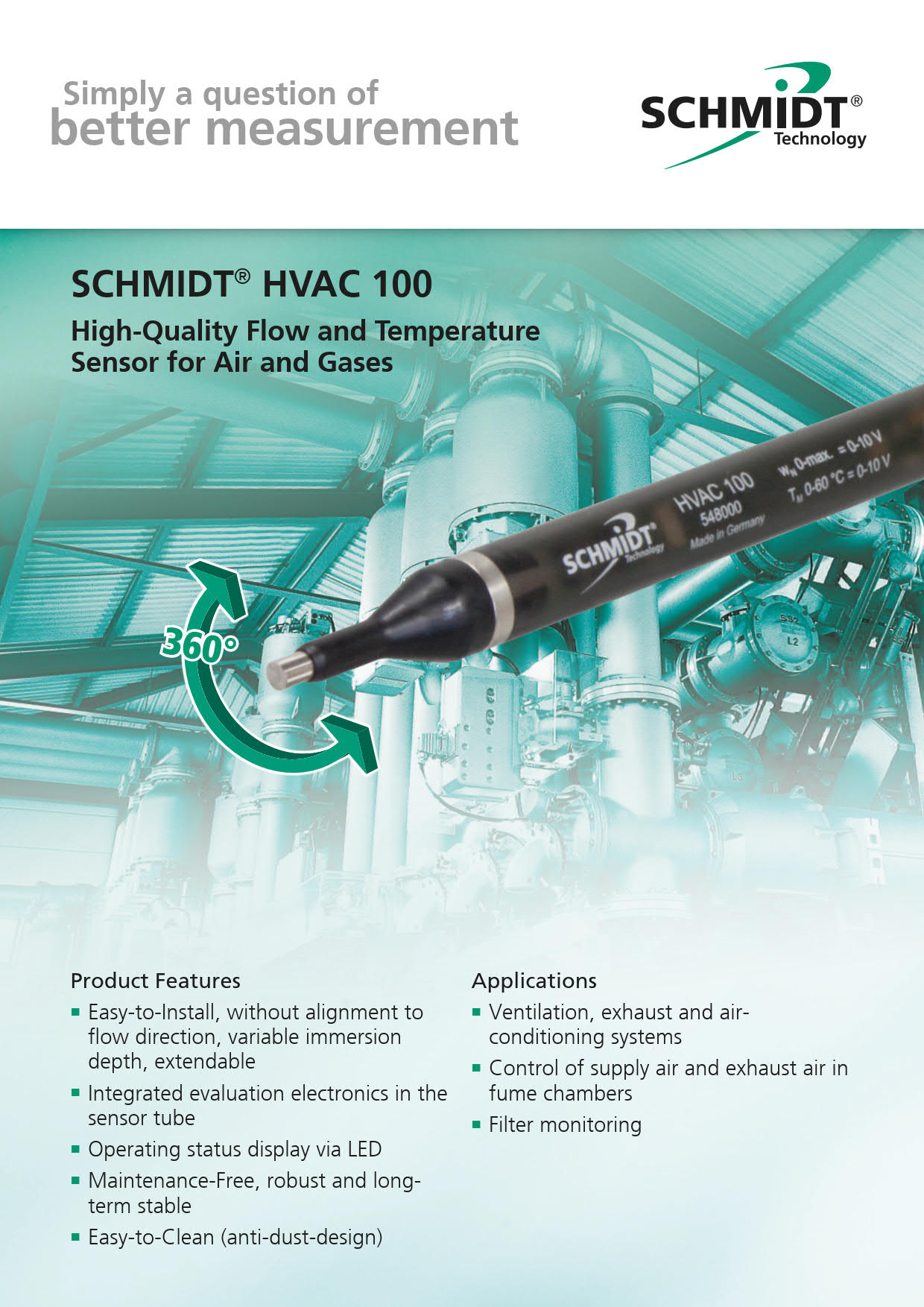 The SCHMIDT HVAC 100 is designed for stationary measurement of the flow velocity and temperature of clean air at atmospheric pressure conditions. The resulting output signal is independent from the pressure and temperature of the medium to be measured. This device features a 360° measuring head which does not have to be aligned to the flow direction and can be extended by additional tubes (variable immersion depth). Furthermore, this sensor is maintenance-free, robust, long-term stable and easy-to-clean and therefore fulfills the main requirements for an efficient installation process. Schmidt HVAC 100 flow sensor models