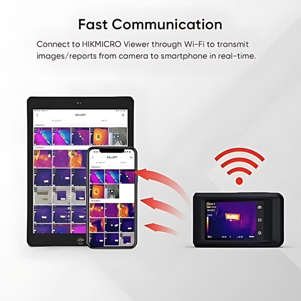 Quick, efficient work Inspectors can identify potential errors quickly and efficiently with the Pocket2. The thermal images and corresponding visual images are saved as radiometric JPEGs for documentation in the internal 16 GB memory at the touch of a button. The results can then be readily shared via WiFi and the HIKMICRO Viewer app. On-site reporting and analysis in real time speeds up the reaction time for repairs, reduces potential costs resulting from downtime and ensure safe operations.