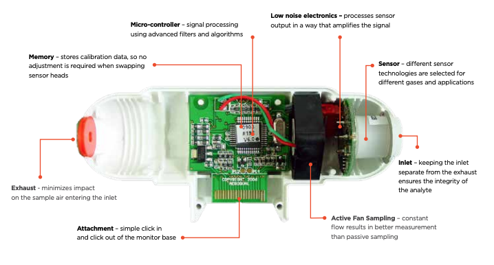 • You can choose from up to 30 different sensor heads. Each sensor contains a single gas or particle sensor. Swapping sensor heads takes seconds and no configuration or re-calibration is required.