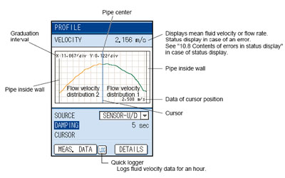 Flow velocity profile measurement(option) -Flow profile can be monitored in real time. Pulse doppler method with specific sensors model FSD is used |