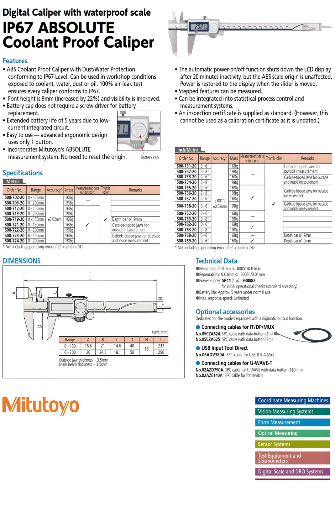 หมวดหมู่ 500-700 Series คาลิเปอร์ดิจิตอลแบบกันฝุ่นและน้ำ(Digital ABS Caliper CoolantProof IP66,IP67),Mitutoyo