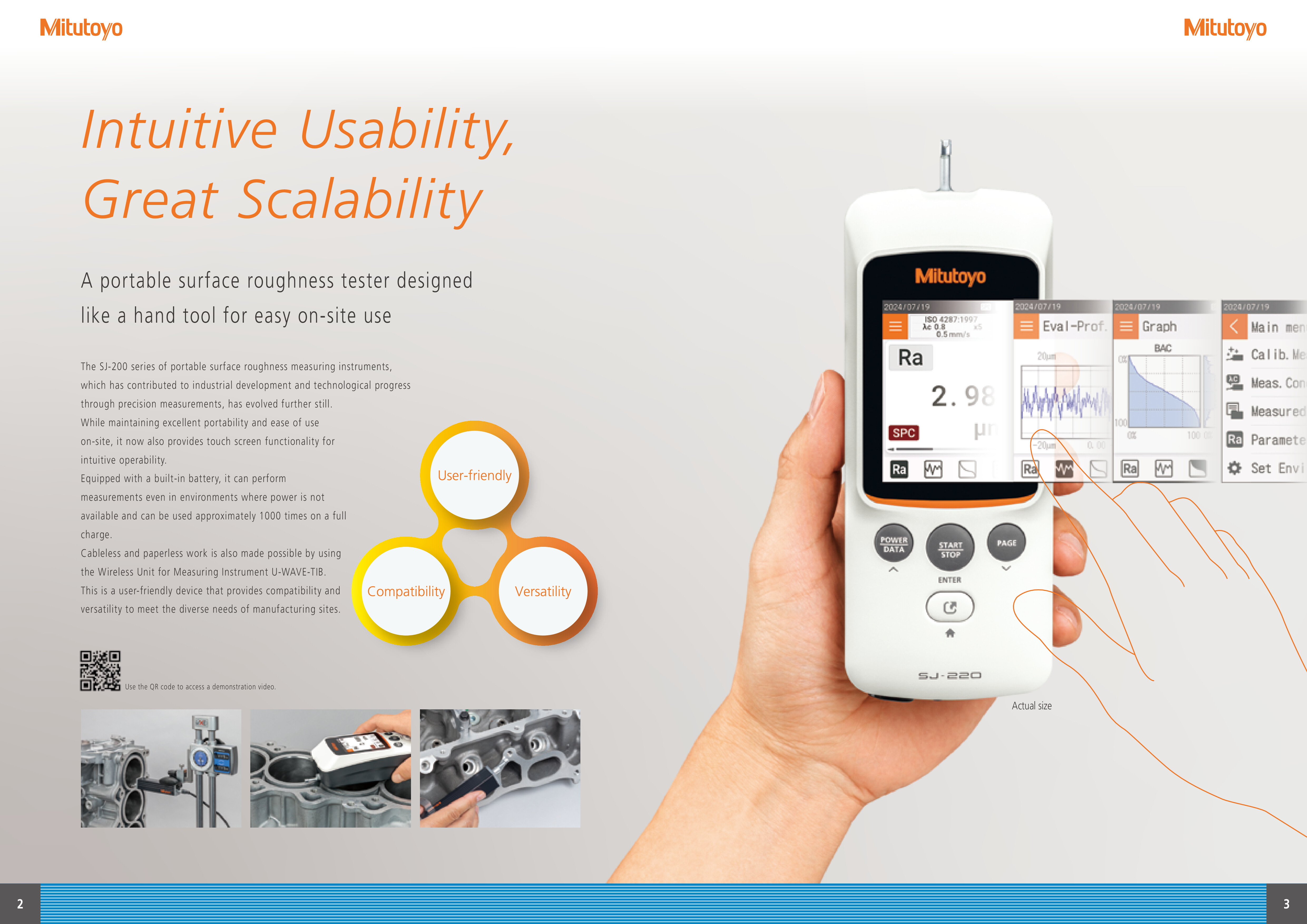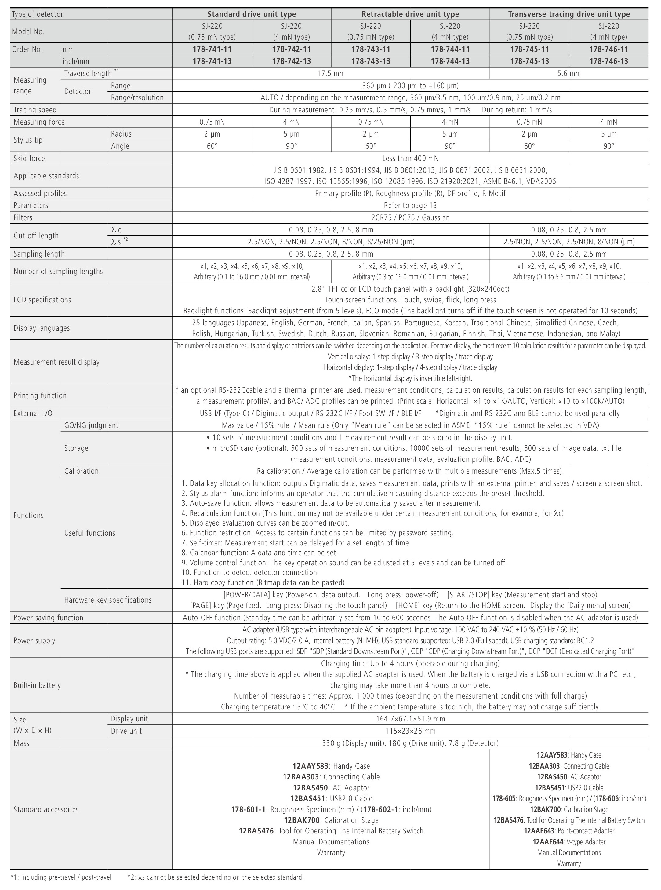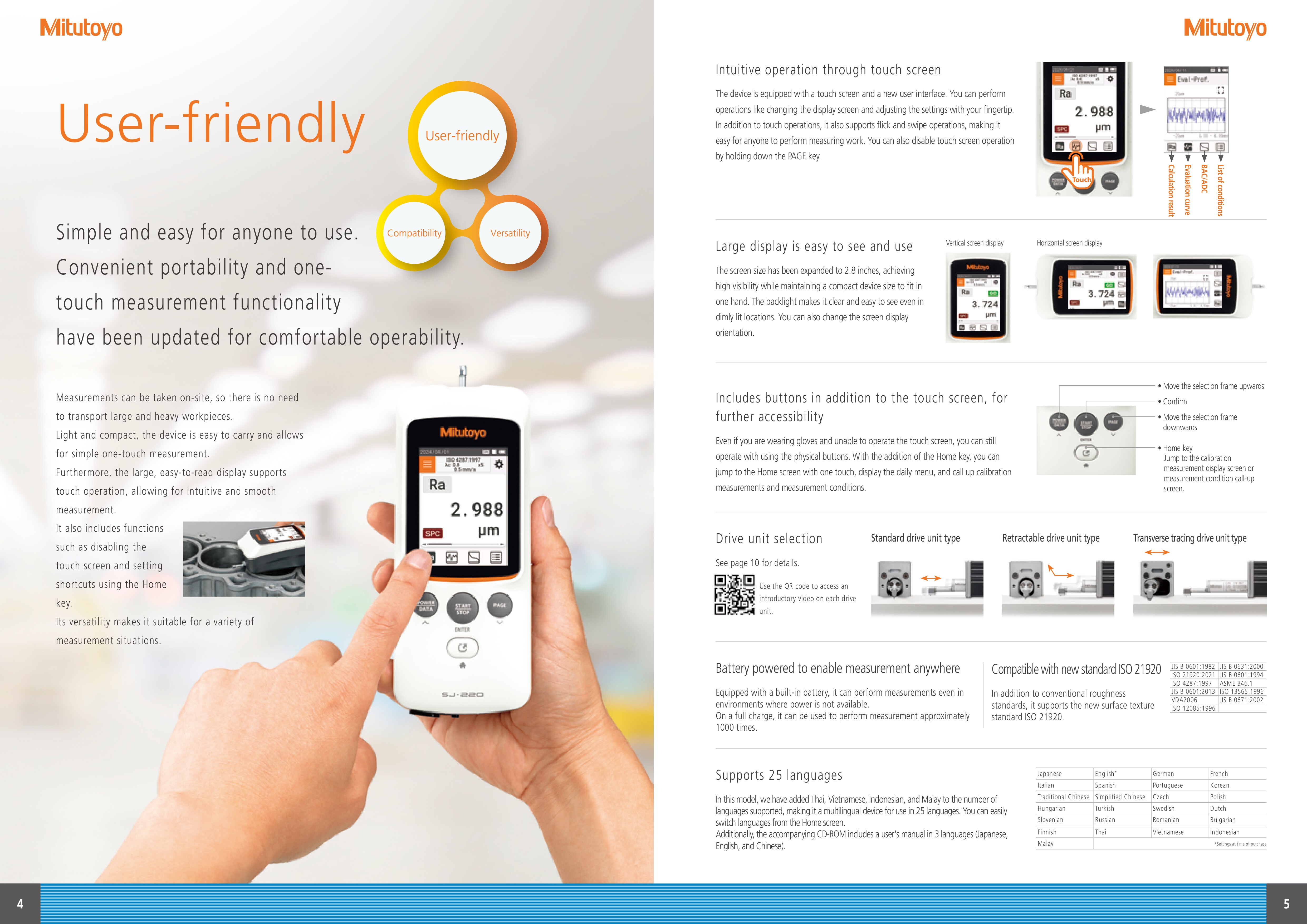 The SJ-220 series of portable surface roughness measuring instruments, which has contributed to industrial development and technological progress through precision measurements, has evolved even further. While maintaining excellent portability and ease of use on-site, it now also provides touch screen functionality for intuitive operability.