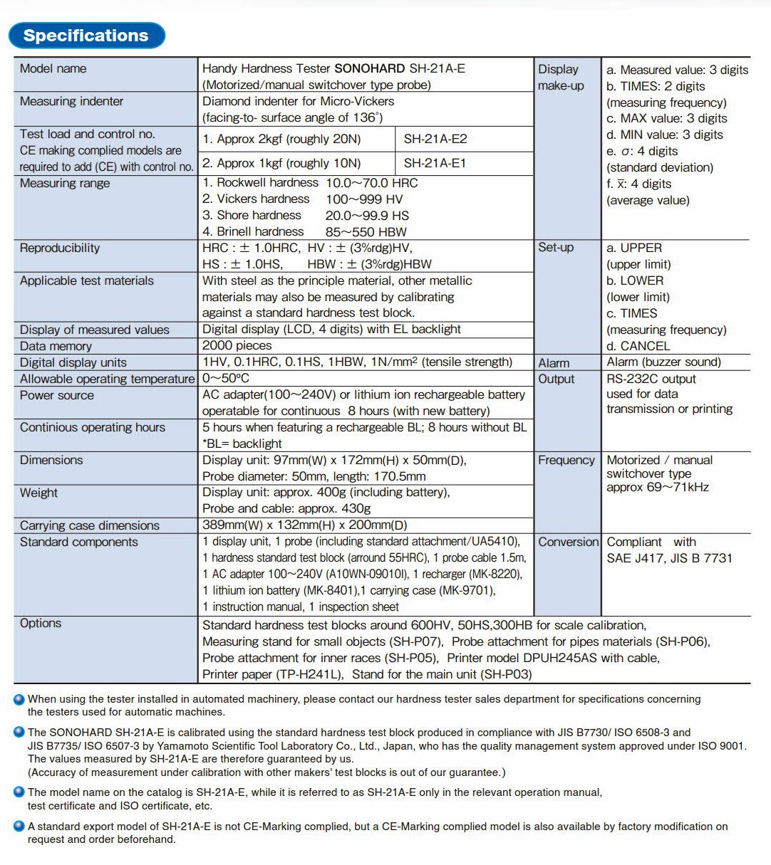 Standard equipment configuration | Display unit, probe (with standard attachment), cable for probe (1.5 m), hardness reference piece (around 55 HRC), AC adapter, charger, lithium ion battery, carrying case, instruction manual, inspection report 1 each |