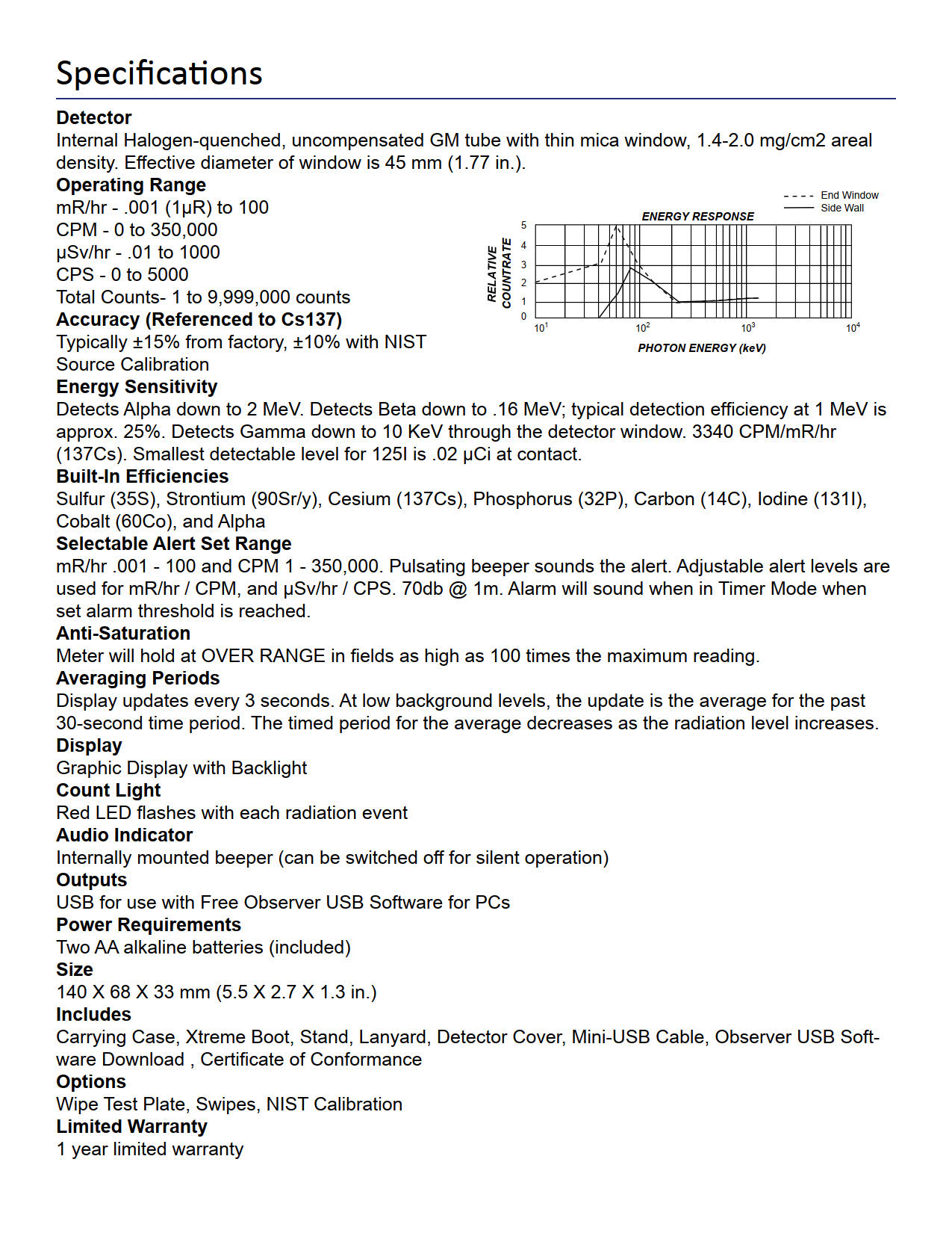 (Referenced to Cs137) Typically ±15% from factory, ±10% with NIST Source Calibration